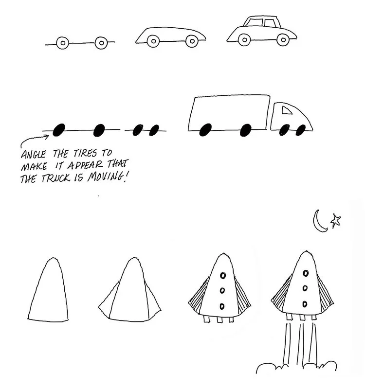 For our next Simple Drawing Tip, we're going to learn how to draw three simple vehicles. Vehicles are an important part of visual language because as mobile objects they can communicate a variety of different ideas quickly.